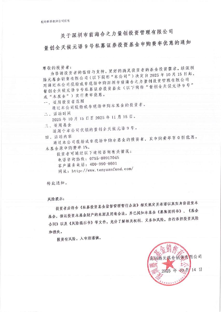 关于量创全天候元语9号私募证券投资基金申购费率优惠的通知