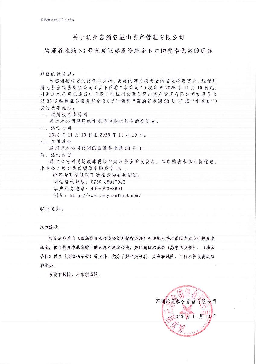 关于富涌谷水滴33号私募证券投资基金B申购费率优惠的通知