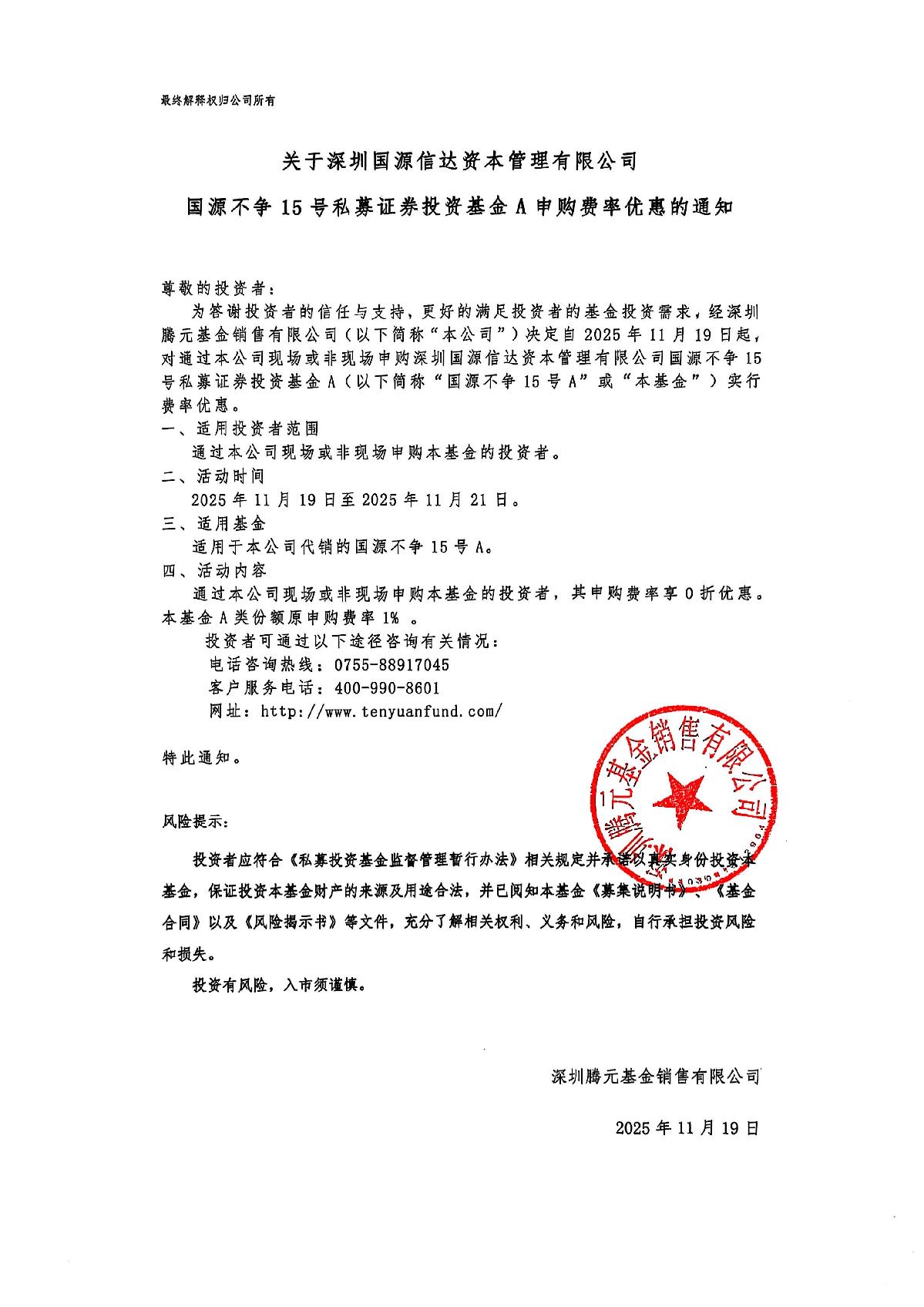 关于国源不争15号私募证券投资基金A申购费率优惠的通知