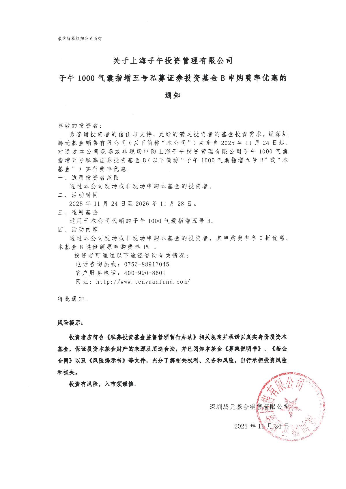 关于子午1000气囊指增五号私募证券投资基金B申购费率优惠的通知